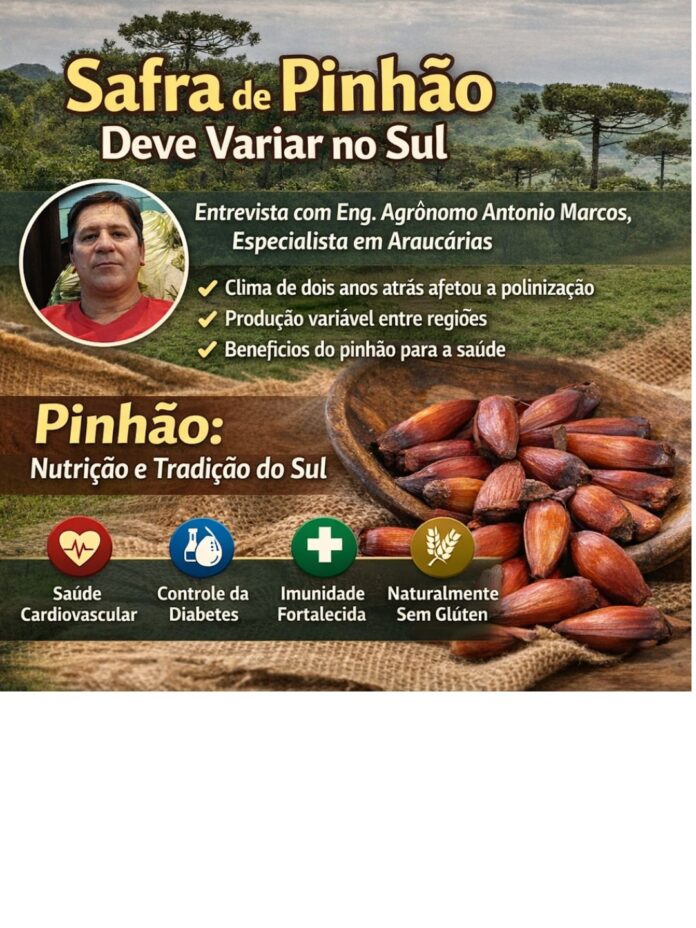 A previsão para a safra de pinhão deste ano indica variações significativas entre as regiões do Sul do Brasil. Em áreas como Bituruna, no Paraná, a expectativa é de baixa produção. A informação é do engenheiro agrônomo Antonio Marcos, especialista em araucárias, que concedeu entrevista exclusiva para esta matéria.