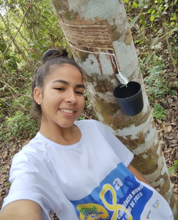 Ao seu lado, a força da família fortalece ainda mais essa trajetória. Participam ativamente da extração sua filha Regiane Assunção, sua esposa dona Raimunda Sabino Assunção e sua neta Raica Assunção, formando um verdadeiro elo de união e continuidade no campo. A imagem da família reunida no seringal não representa apenas trabalho —